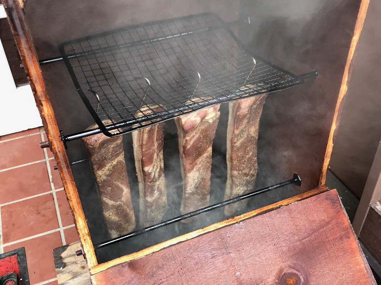 【マツコの知らない世界】で燻製特集をしているのを見たひーちゃんが、おぉ!これはすごい!『八王子燻製会』様に問い合わせしてっ!との指令を受け…(^◇^;)(いつも突然のひらめきをする姫…..)ご伝授頂き、設計図を見てあーでもないこーでもないと(ケンカしながら)二人で自家製燻製器を造りました! 高さ1mくらいの燻製BOX完成〜☆(変わった形してるでしょ?これには理由があるんだよ) この特製燻製BOXで作ると一味違うんです!! 特製調味料で味付け…3日 塩抜き…1日 乾燥…1日 乾燻…4時間 香り付け(燻製)…3時間 仕込みに約1週間ほどかけてようやく出来上がり♪ 数に限りがありますので売切れになってしまうこともあります。 早い者勝ちで〜〜す♪(≧∀≦)